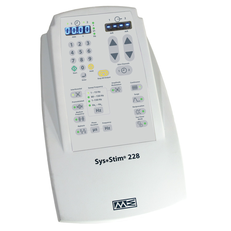 The Sys*Stim 228 neuromuscular stimulator has four discrete waveforms: Interferential, Premodulated, Medium Frequency (Russian) and Biphasic waveforms. In addition the clinician can set on/off times, pulse width and frequency along with frequency modulation for some of the waveforms. An optional carrying bag » made especially for the Sys*Stim 228 and its accessories is available as well as a treatment cart that also will hold the Sonicator 740.