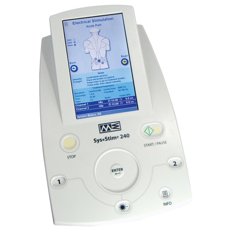 The Sys*Stim 240 neuromuscular stimulator has nine discrete waveforms: Interferential (4 pole), Premodulated (2 pole), Medium Frequency (Russian), Biphasic, High Volt Pulsed Galvanic, Microcurrent, TENS-Asymmetrical Biphasic, TENS-Symmetrical Biphasic and Galvanic (Continuous DC) waveforms. In addition the clinician can set on/off times, up and down ramps, pulse width and frequency along with frequency modulation for some of the waveforms. The 240 offers both laser and infrared technology. Unlike most other units, the 240 has the light therapy software already built into the unit. All you need to do is purchase either the laser probe or the cluster probe for light therapy capabilities.